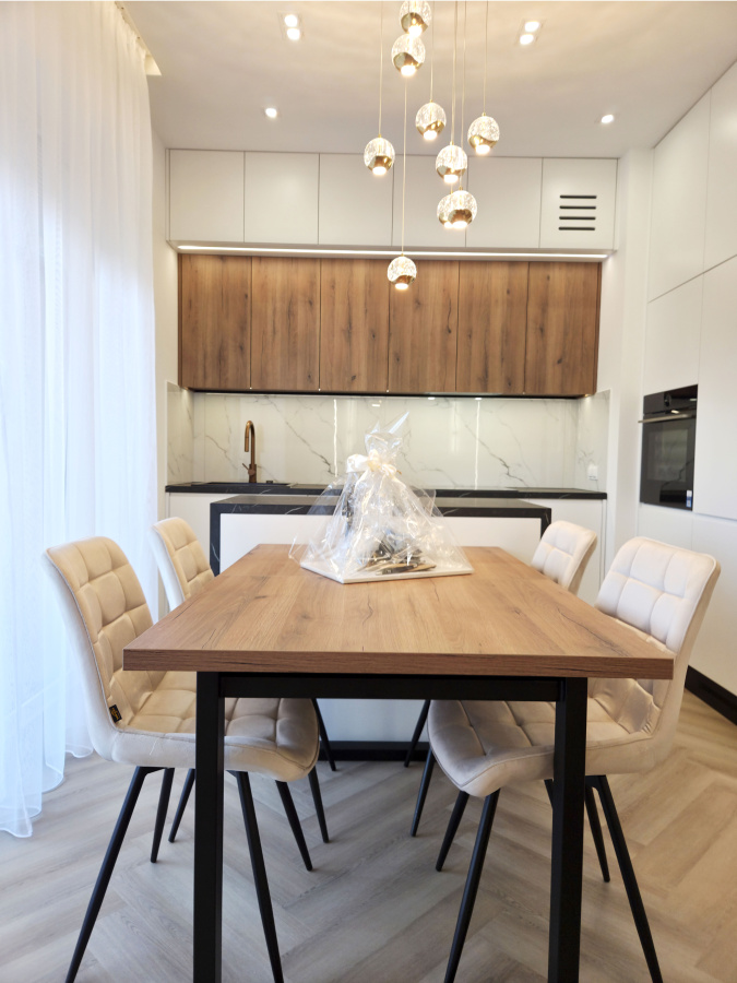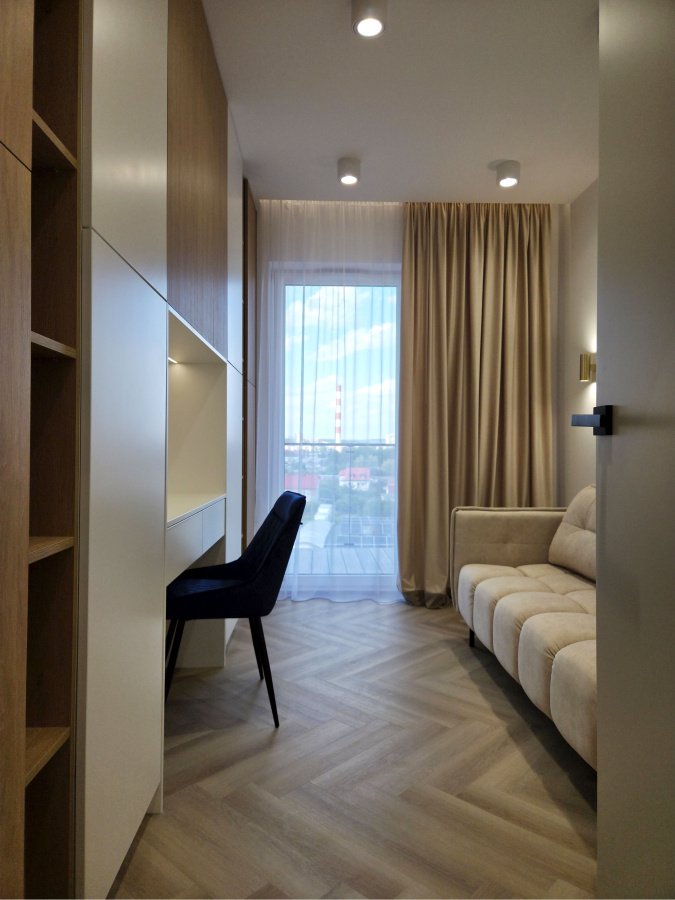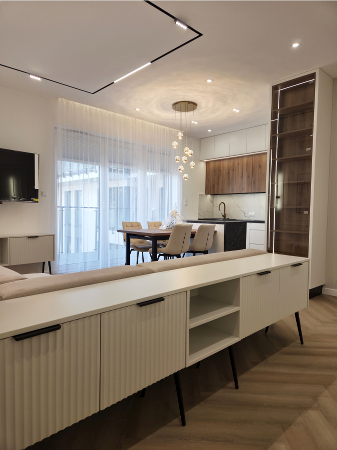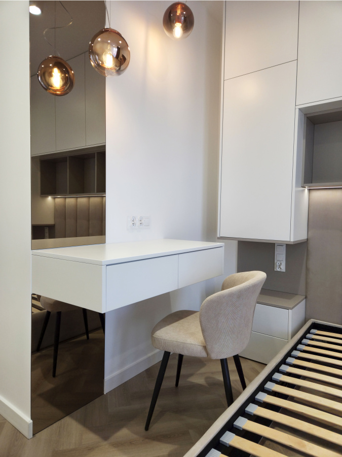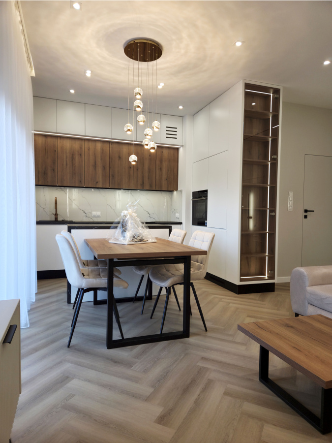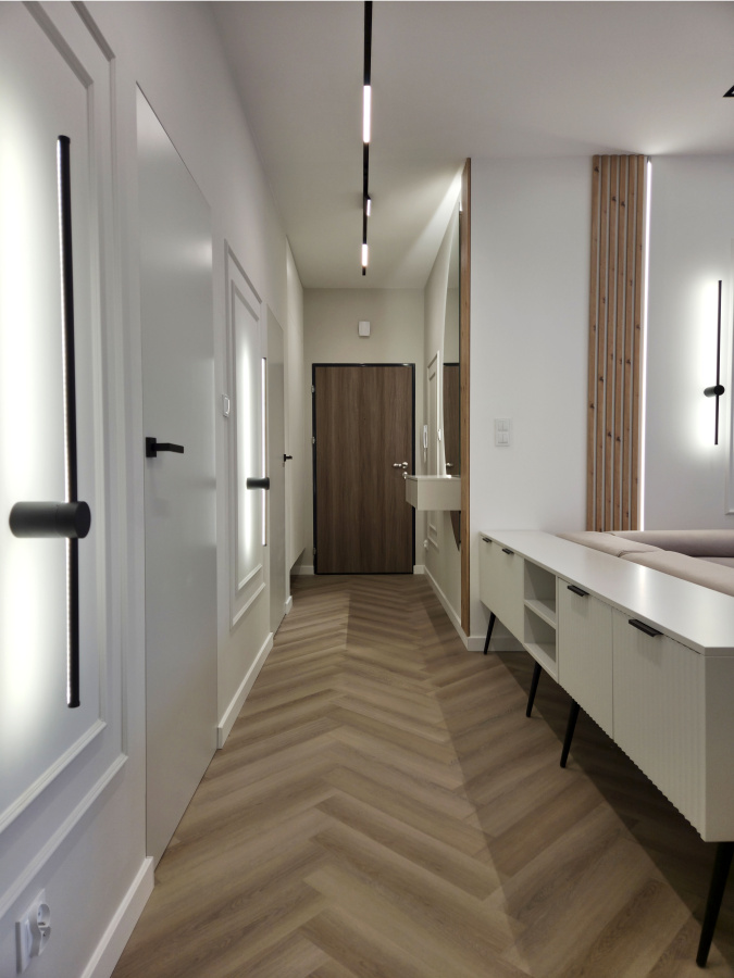 Nasza realizacja pokazuje, że wykończenie mieszkania pod klucz może być także synonimem luksusu. Zadbaliśmy o każdy szczegół – od wysokiej jakości materiałów, przez eleganckie meble na wymiar, po designerskie dodatki.