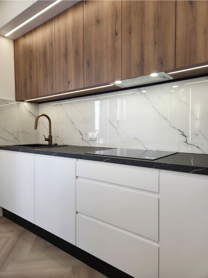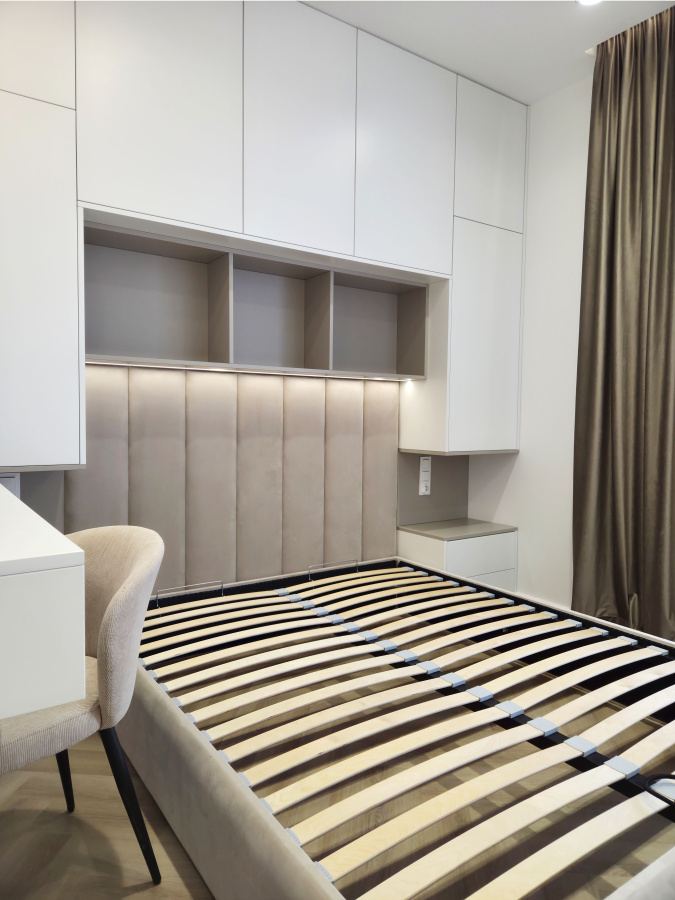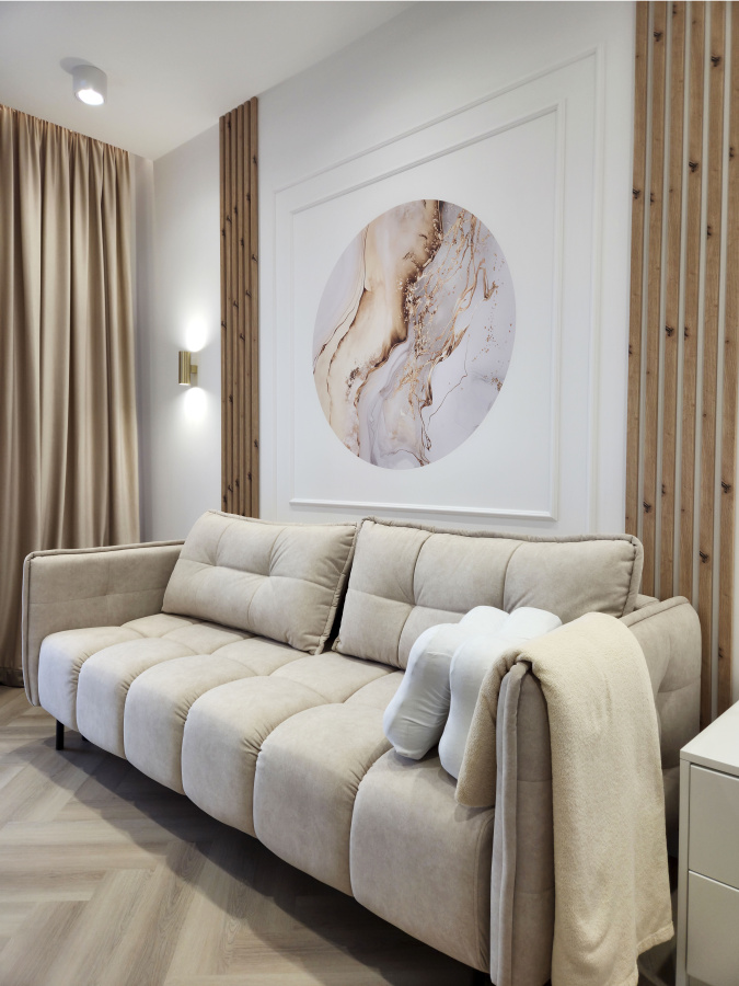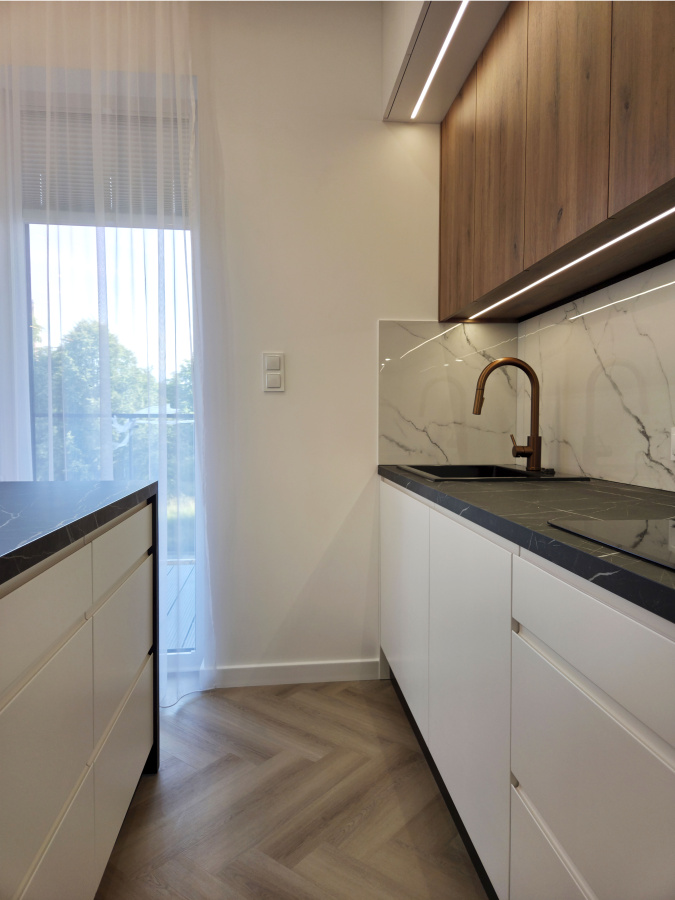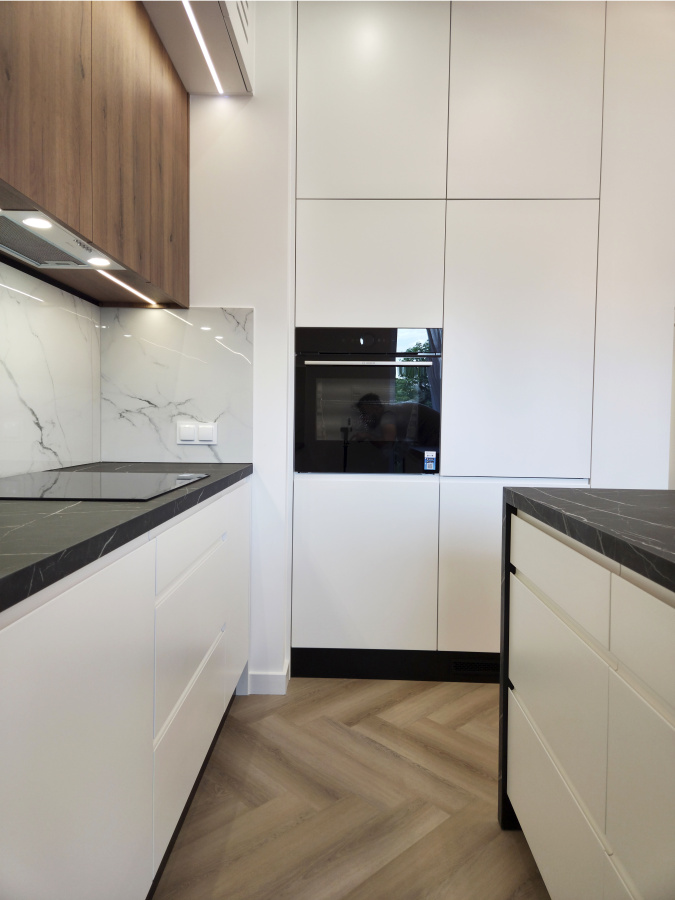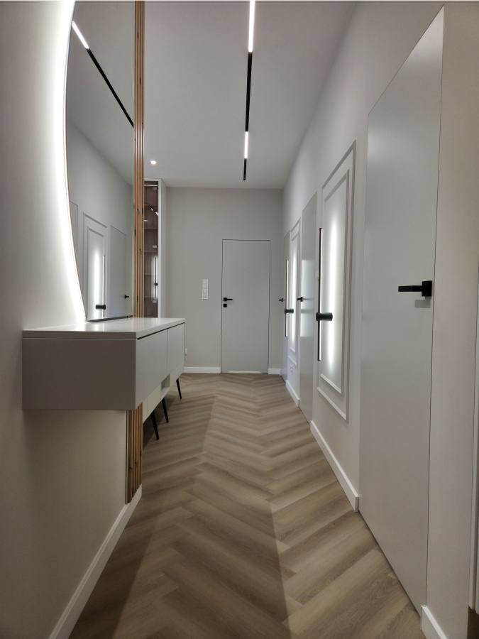 Nasza realizacja pokazuje, że wykończenie mieszkania pod klucz może być także synonimem luksusu. Zadbaliśmy o każdy szczegół – od wysokiej jakości materiałów, przez eleganckie meble na wymiar, po designerskie dodatki.