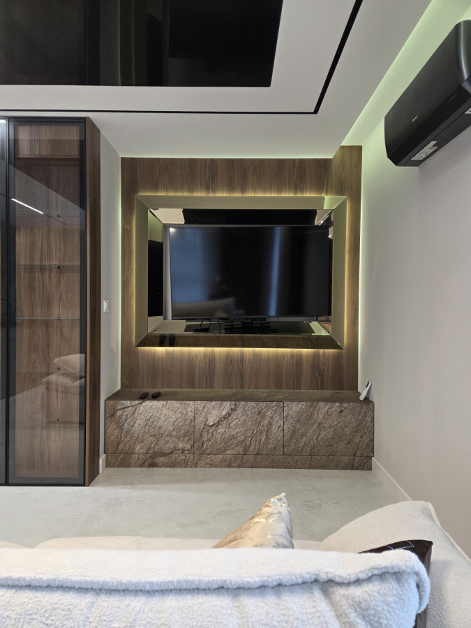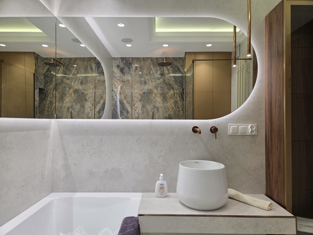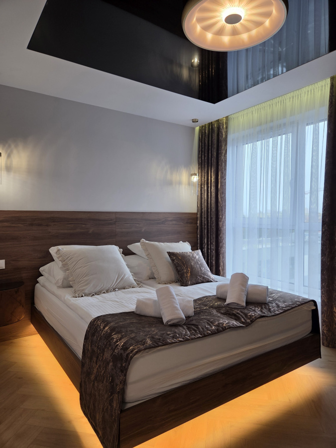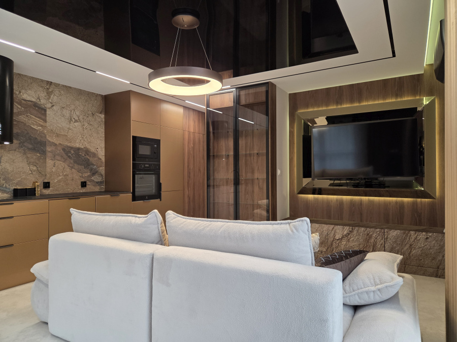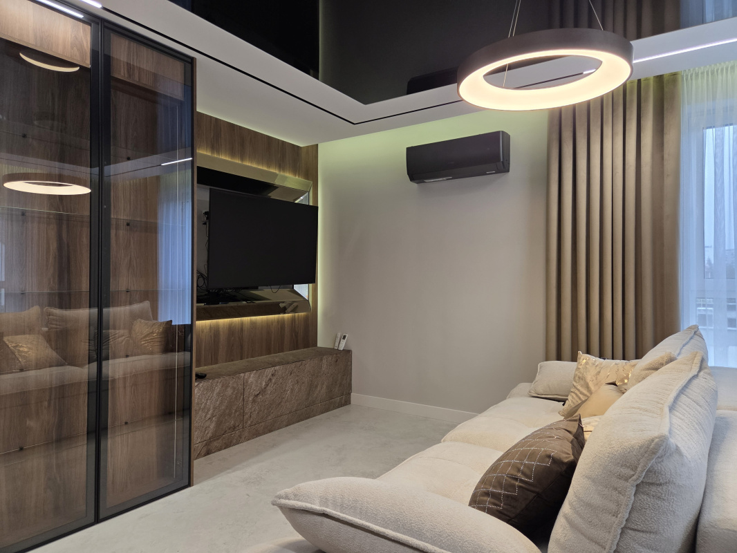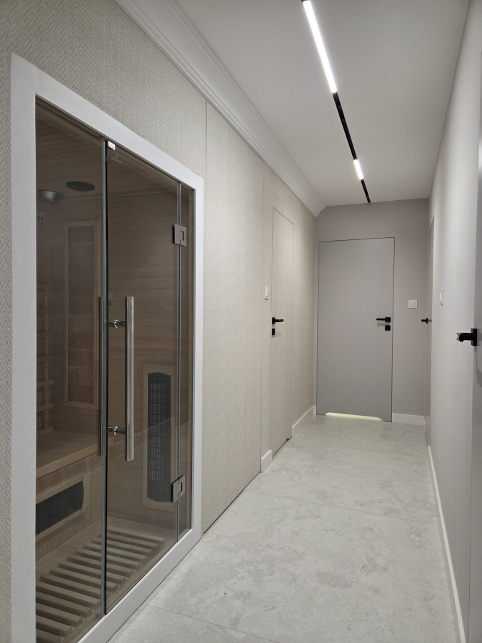 Centralnym punktem projektu jest nowoczesny sufit napinany z efektownym oświetleniem LED, które podkreśla architekturę przestrzeni i pozwala tworzyć nastrojowy klimat o każdej porze dnia. W strefie relaksu znalazła się prywatna sauna, dzięki której codzienność nabiera odrobiny luksusu.