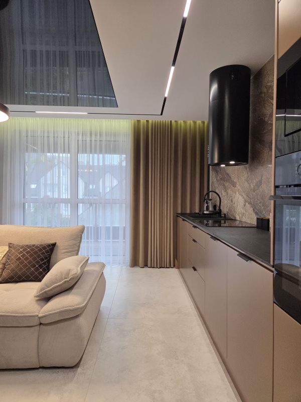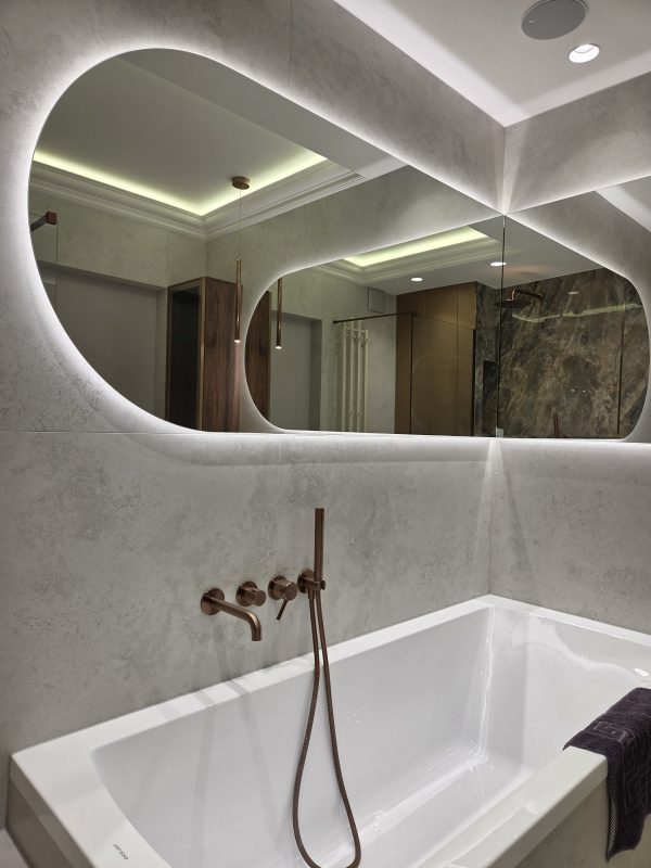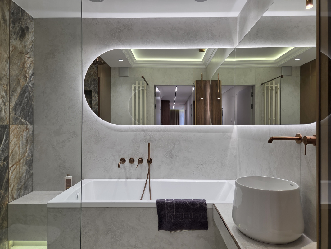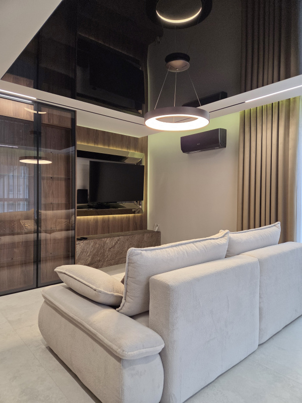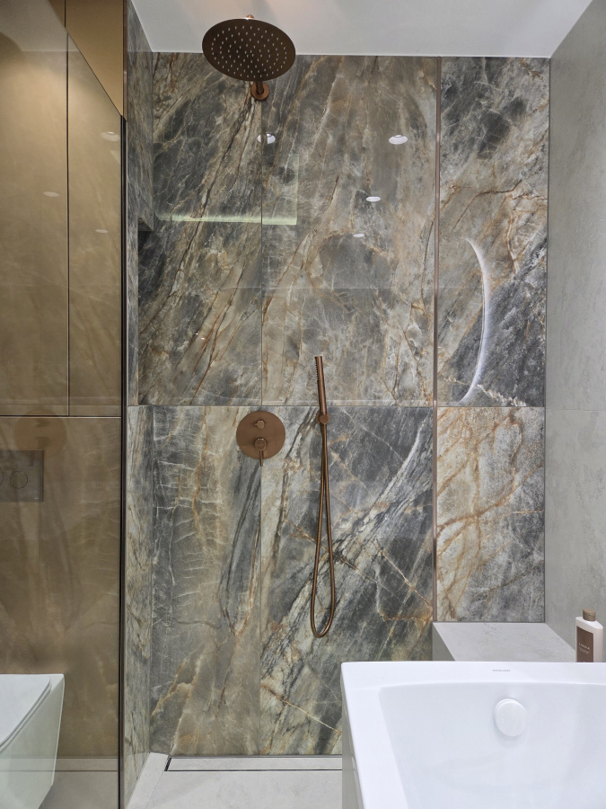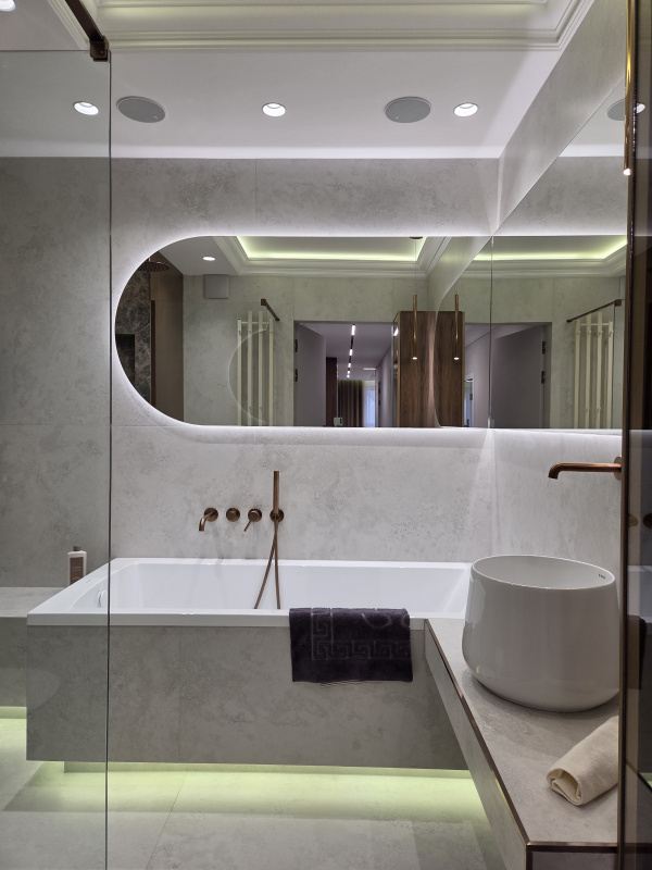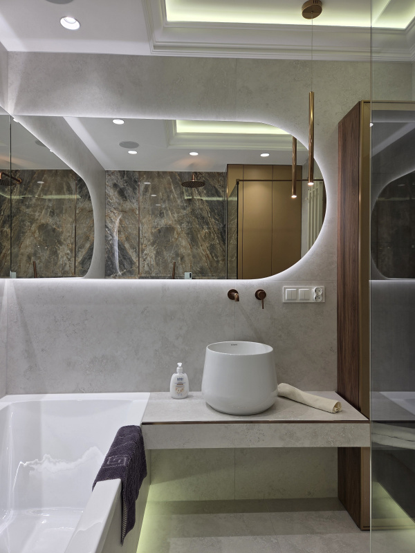 Centralnym punktem projektu jest nowoczesny sufit napinany z efektownym oświetleniem LED, które podkreśla architekturę przestrzeni i pozwala tworzyć nastrojowy klimat o każdej porze dnia. W strefie relaksu znalazła się prywatna sauna, dzięki której codzienność nabiera odrobiny luksusu.